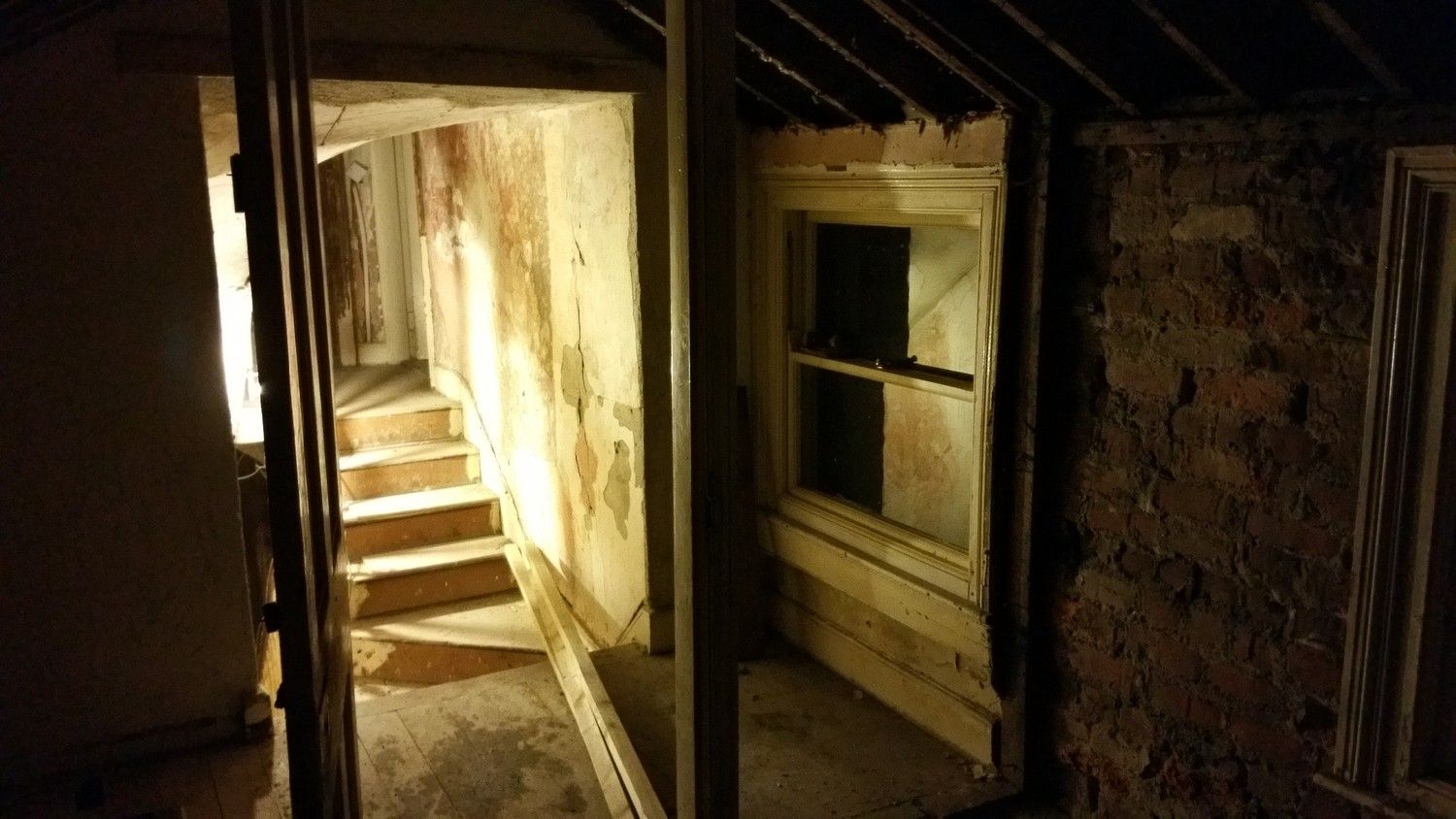 It's unclear whether this fireplace was ever used, as the floorboards seem to be original and there's no slate hearth installed. The underside of the floor does reveal that a hearth was provided for in the form of reinforced joists, but it looks like it was bricked up quite early on.