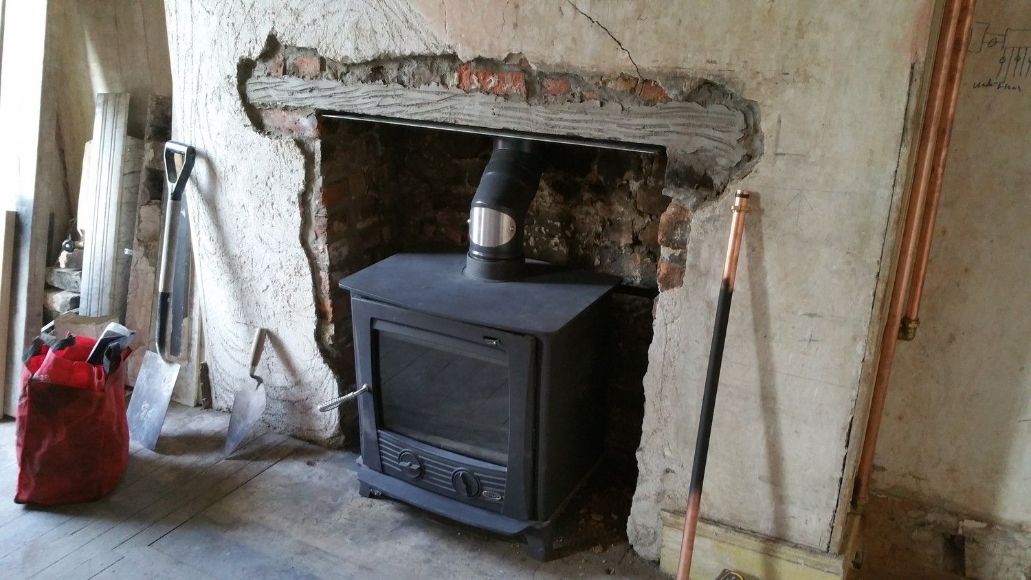 The 21 KW Henley Druid Boiler stove being plumbed into position: