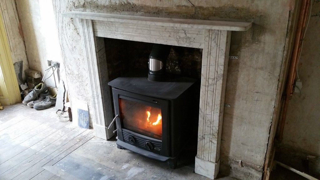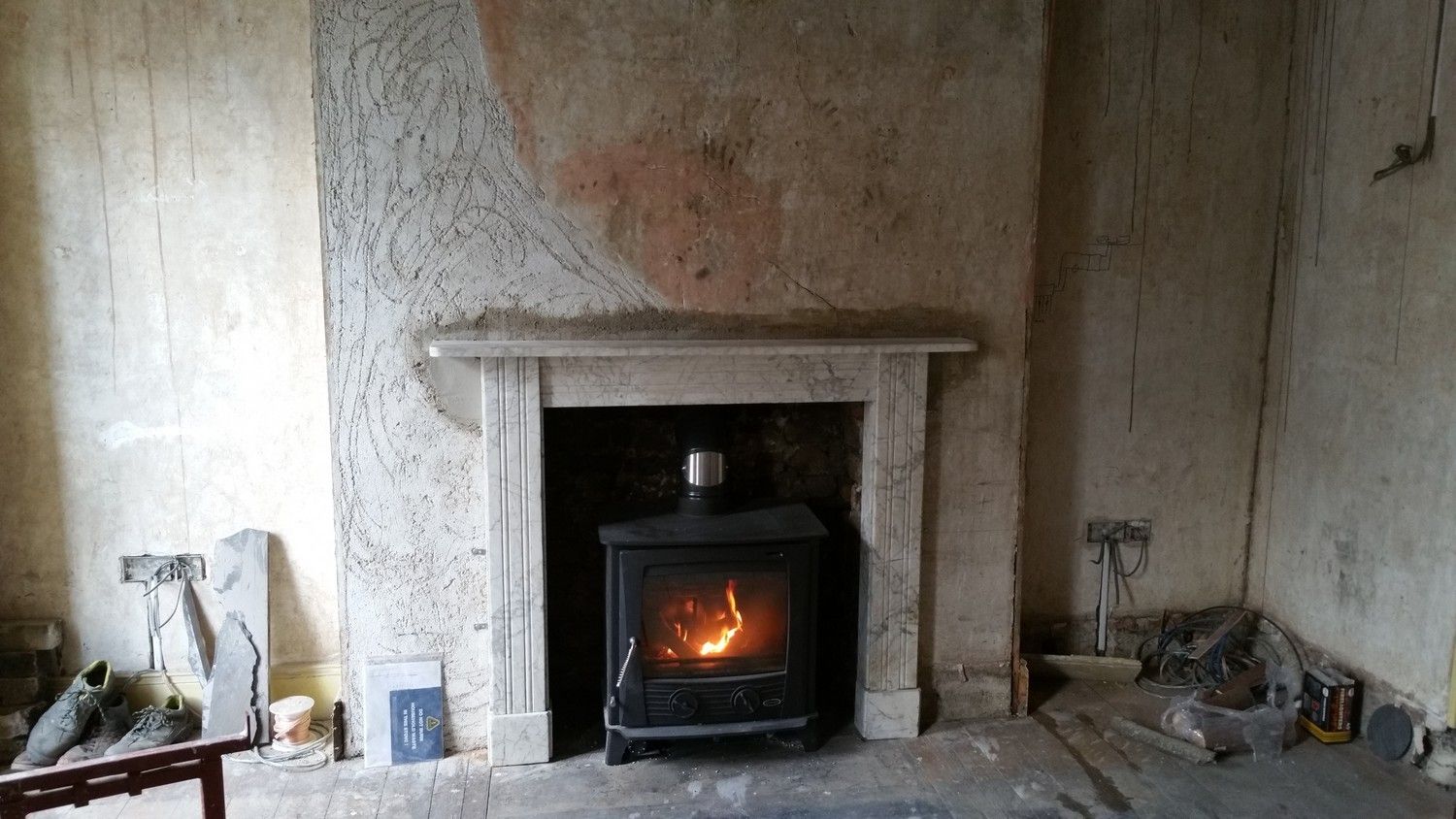 The boiler aspect of the stove works extremely well. There are two pipes running from the rear of the stove, an exit flow and a return flow. The pipes penetrate the right side of the chimney breast and rise up into the ceiling, where they join further pipework that runs to the attic where the thermal store is located. The pipework on the side of the breast will be concealed by the time this room is completed.