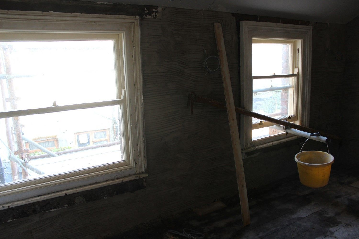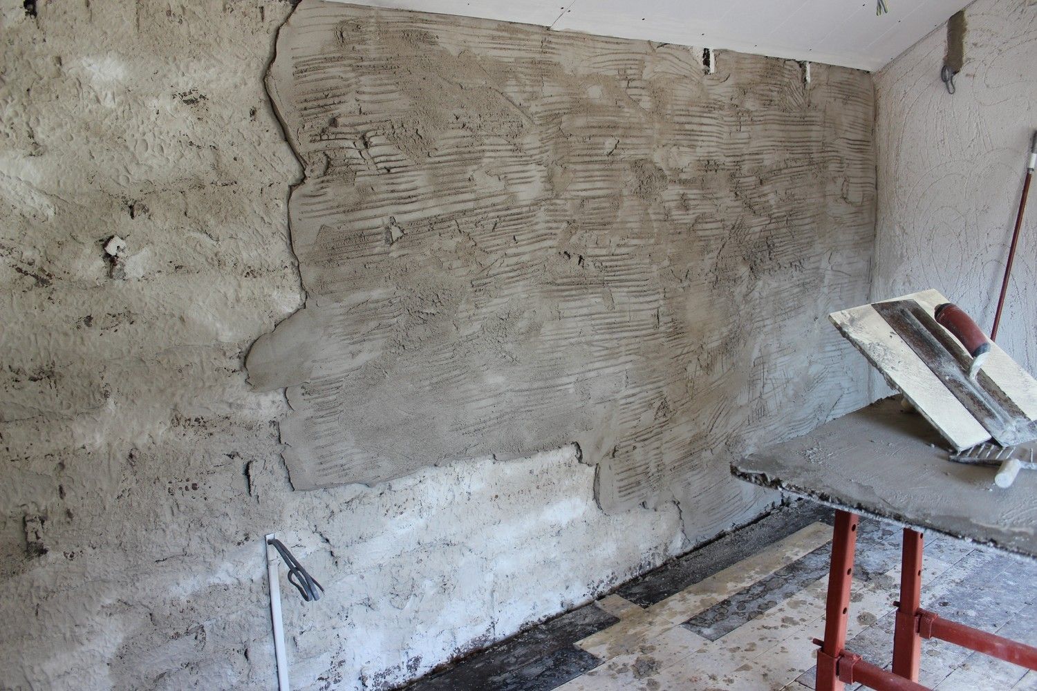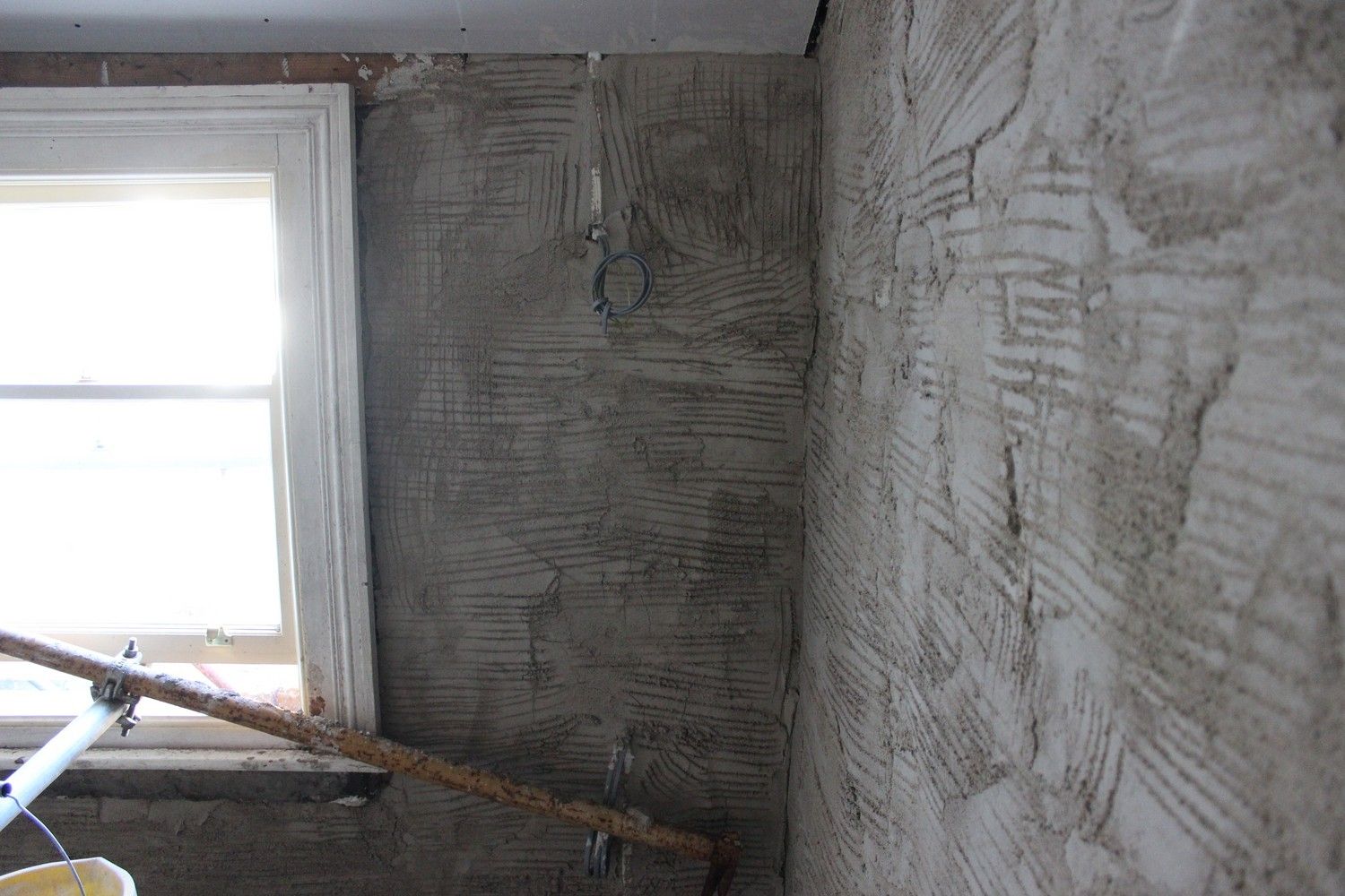 As mentioned above, Gutex wood-fibre insulating board will be used on the walls, to maintain the breathability of the structure. To attach this to the wall, they first need to be finished with lime render in order to give a flat, level surface to attach to. So two heavy coats need to be applied to the red brick walls.