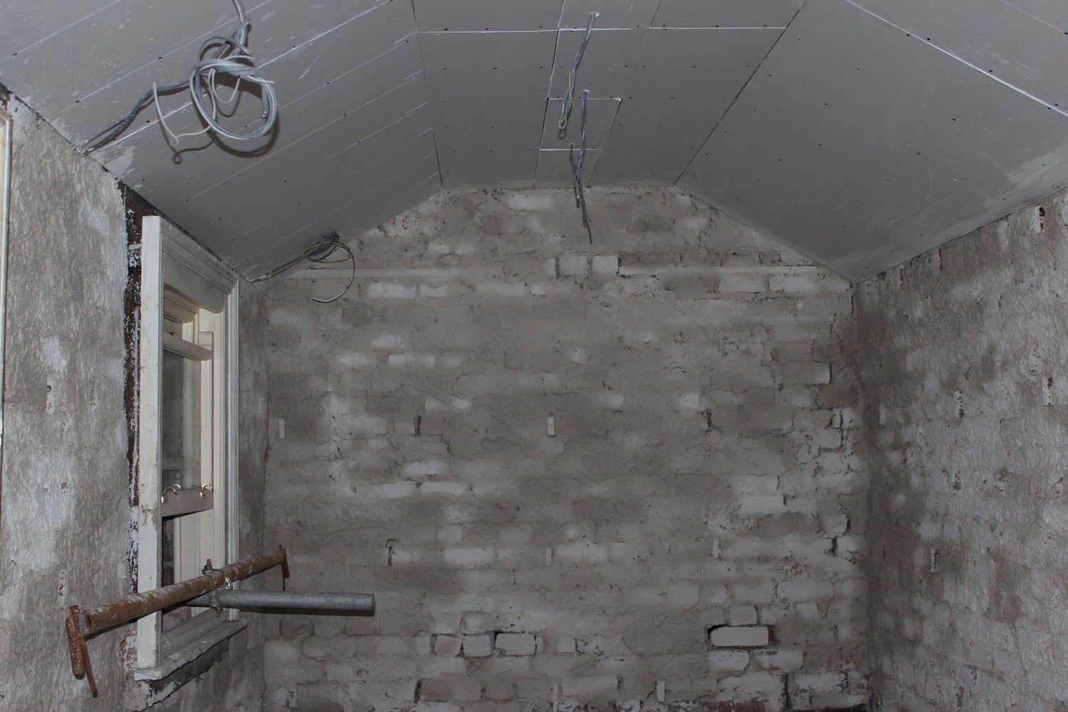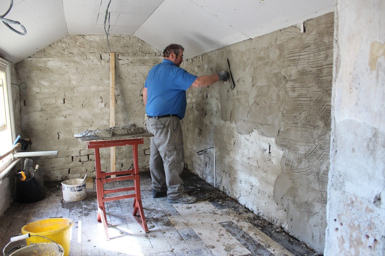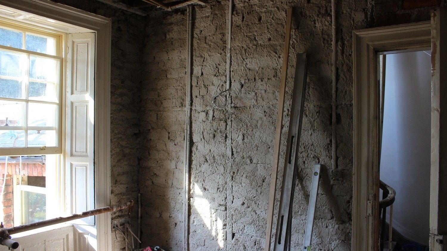 As mentioned above, Gutex wood-fibre insulating board will be used on the walls, to maintain the breathability of the structure. To attach this to the wall, they first need to be finished with lime render in order to give a flat, level surface to attach to. So two heavy coats need to be applied to the red brick walls.