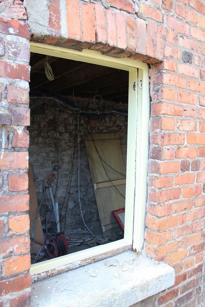 After just three days, the return is already transforming into another finished section of the house. Built circ. 1900, the red brick return likely replaced the original 1820s stone built return, possibly due to subsidence. It's a single brick layer, non cavity construction, two story structure with one-over-one sash windows and an accompanying 1950s/1960s single story lean-to extension.