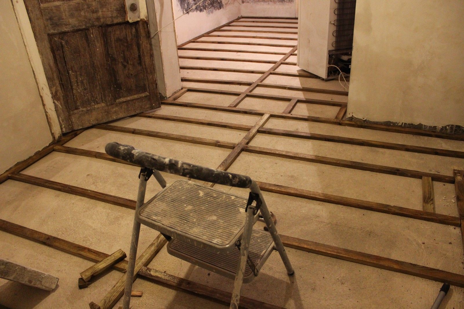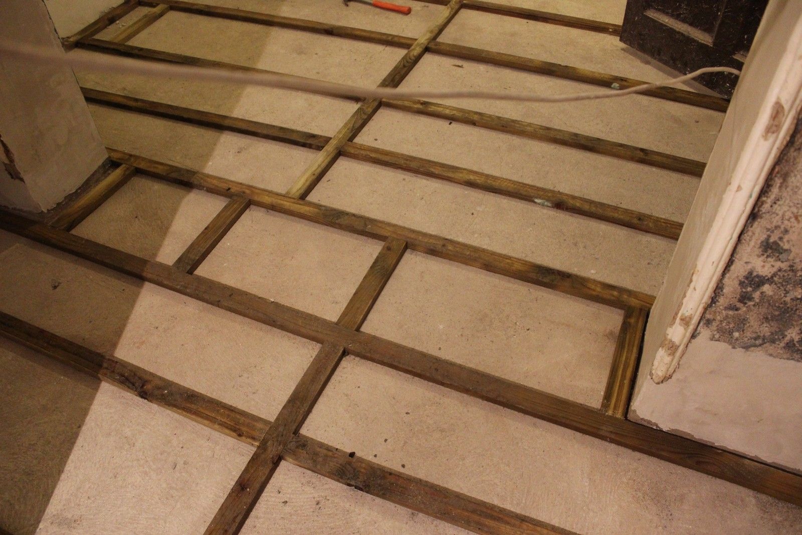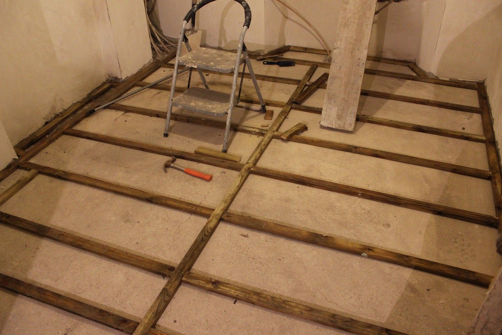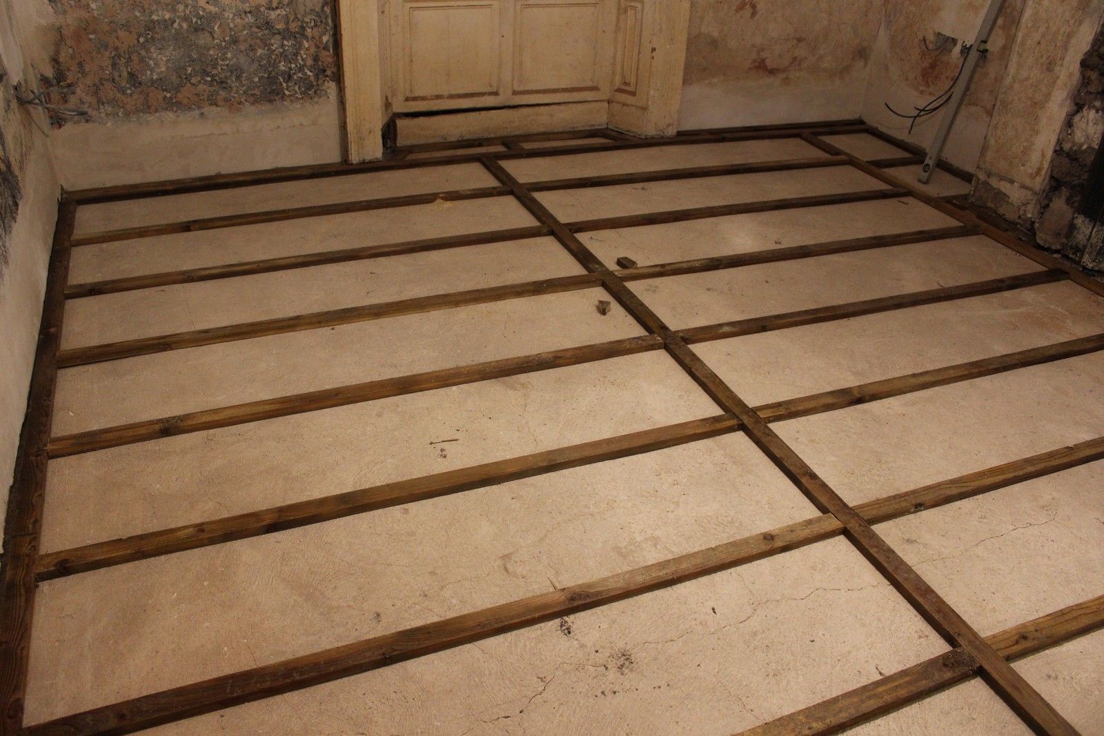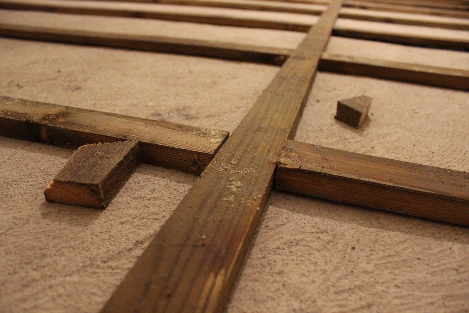 The battens are laid out as seen below, before the limecrete mix can be poured and levelled around them. The battens are pressure-treated ensuring long service life. Unfortunately the battens were quite wet due to outside storage, so require some time to dry out.
