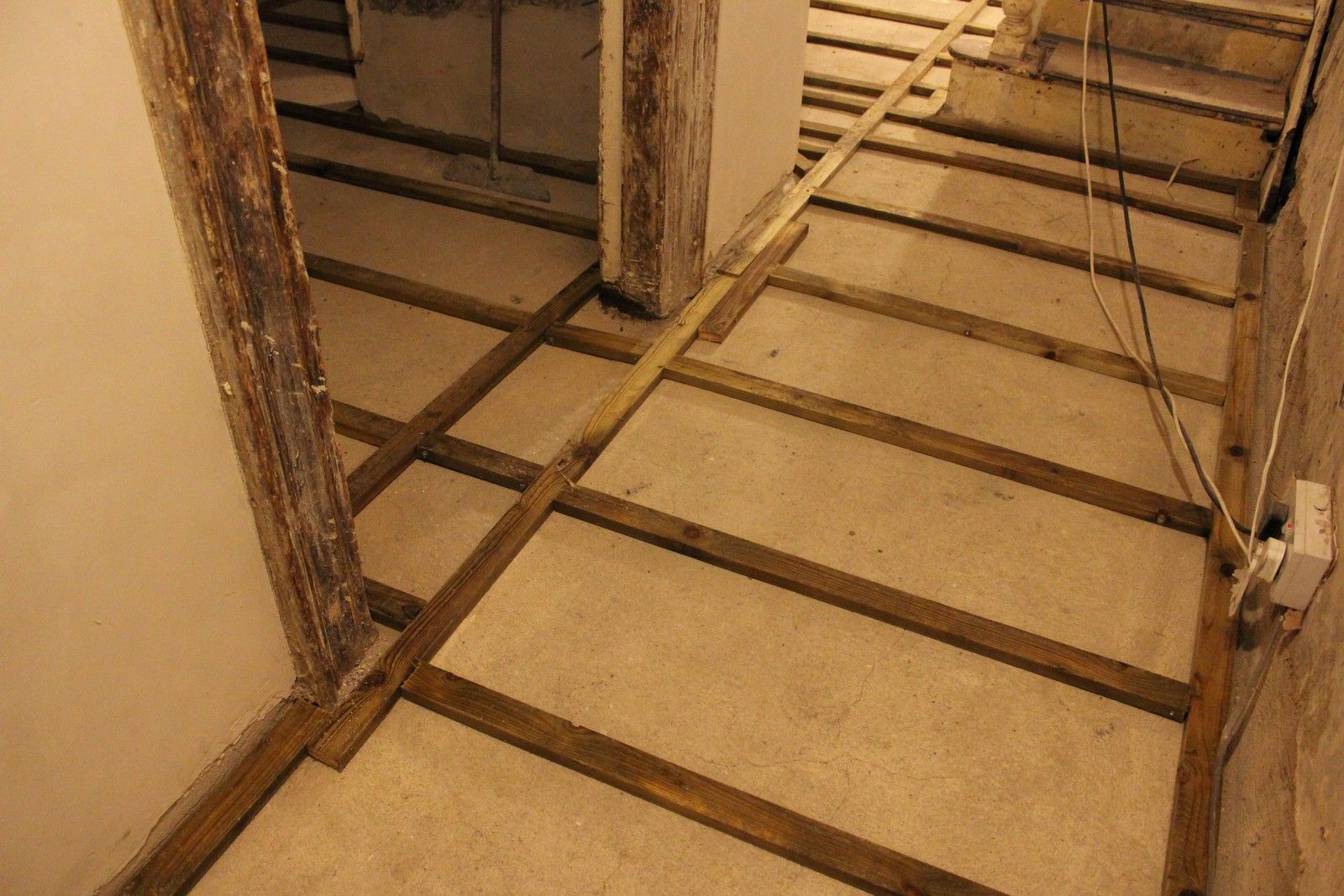 The battens are laid out as seen below, before the limecrete mix can be poured and levelled around them. The battens are pressure-treated ensuring long service life. Unfortunately the battens were quite wet due to outside storage, so require some time to dry out.