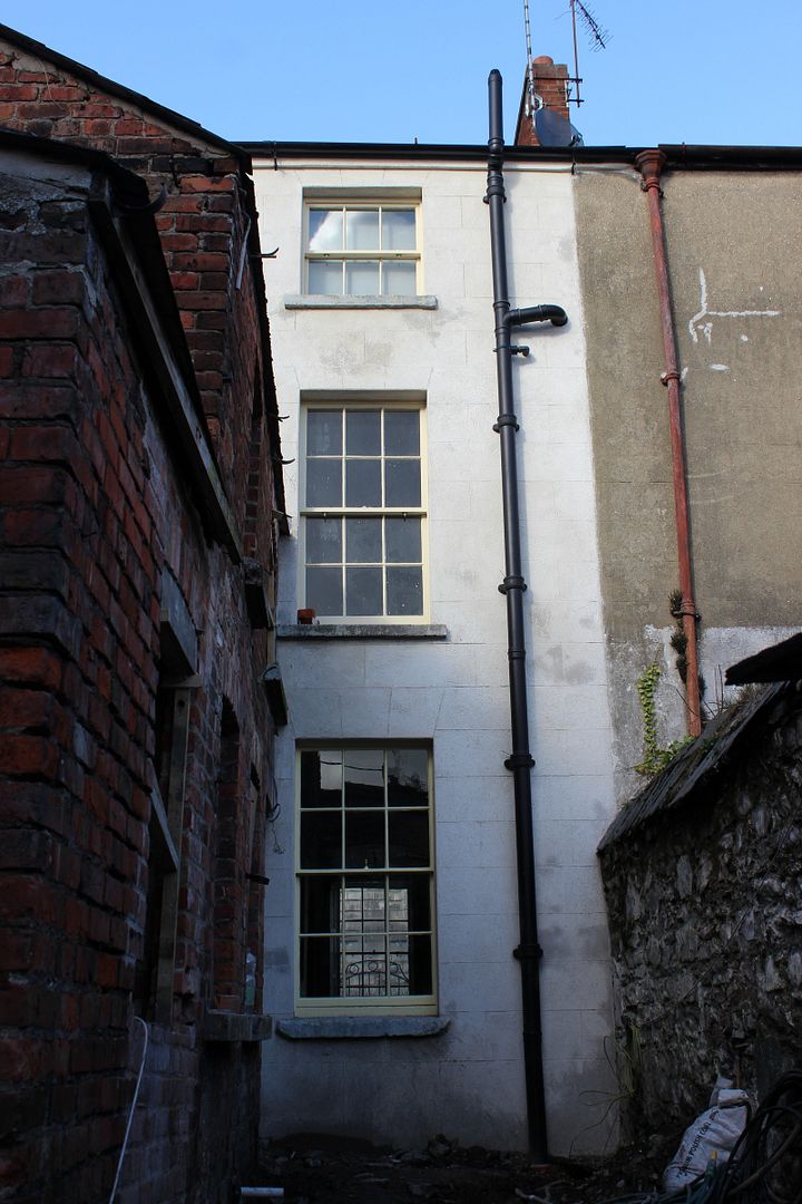 I originally had planning permission to knock the small 1950's lean-to extension at the back of the return, however have since decided to keep it and have two new sash windows made and installed to open up the interior space. The sashes will be made by a local joiner to match the existing original sashes exactly. One of the windows will fill an existing opening, the other will position in a new opening at the end of the extension: