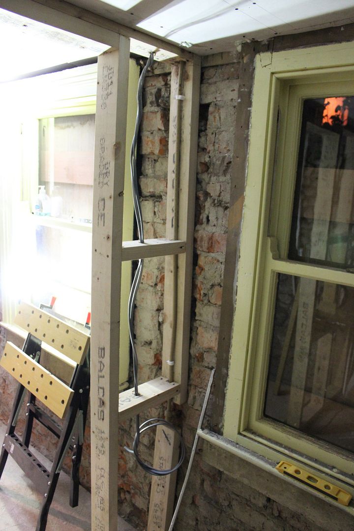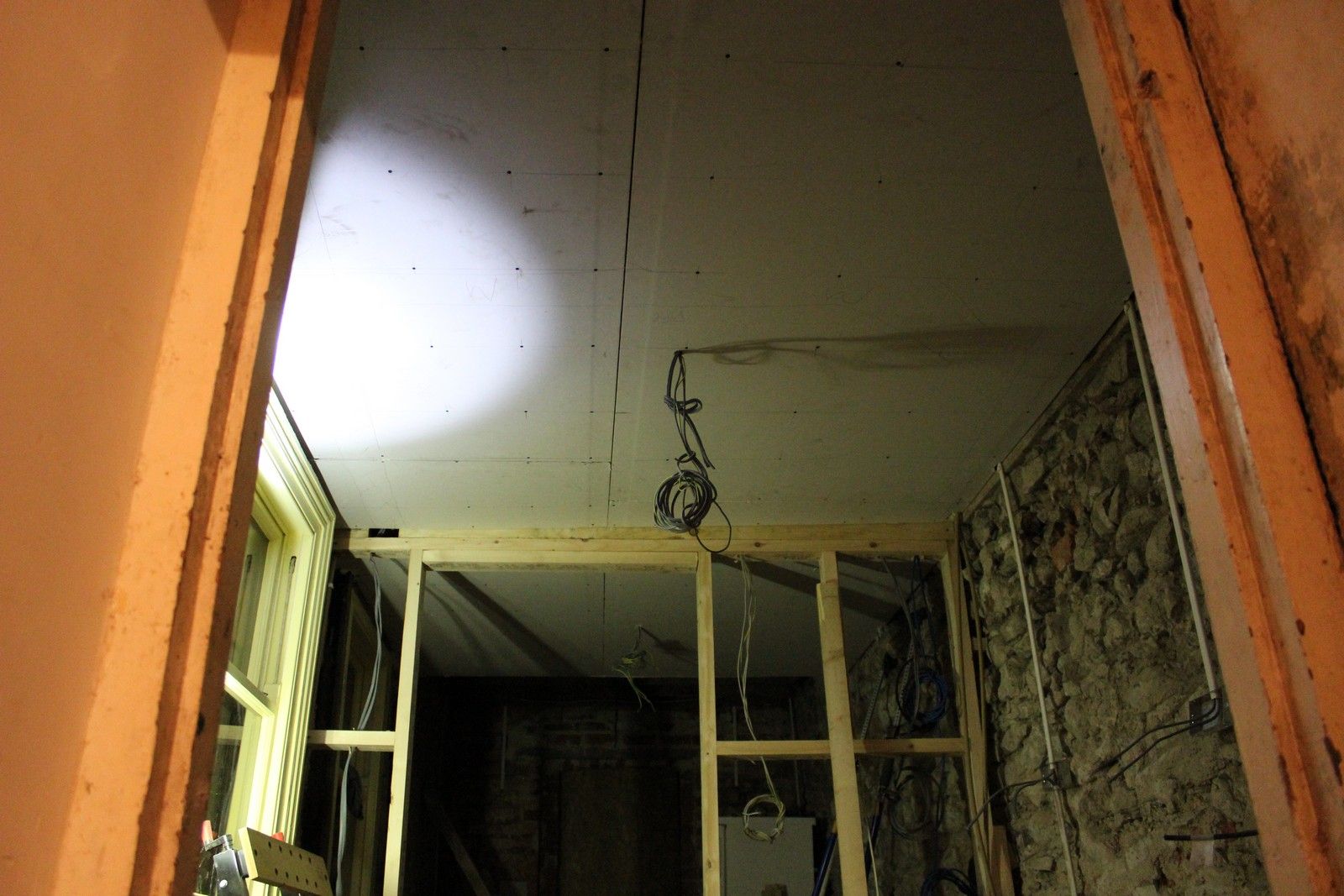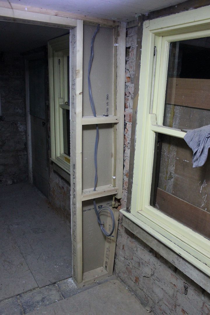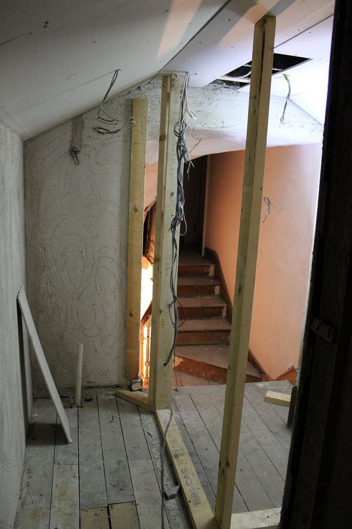 The wall layout upstairs in the return is based pretty much exactly on what was originally there before, with the exception of the extended wall for the small bathroom to be located on the right side. In the picture below, the studs on the right side make up the new bathroom wall, where the hot press was originally located: