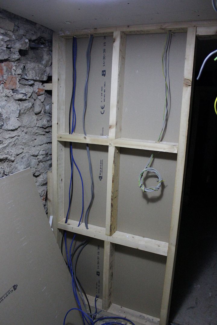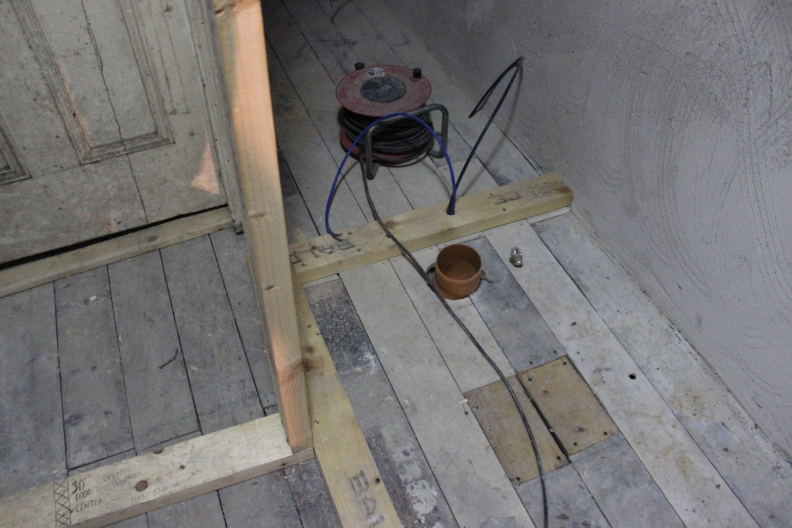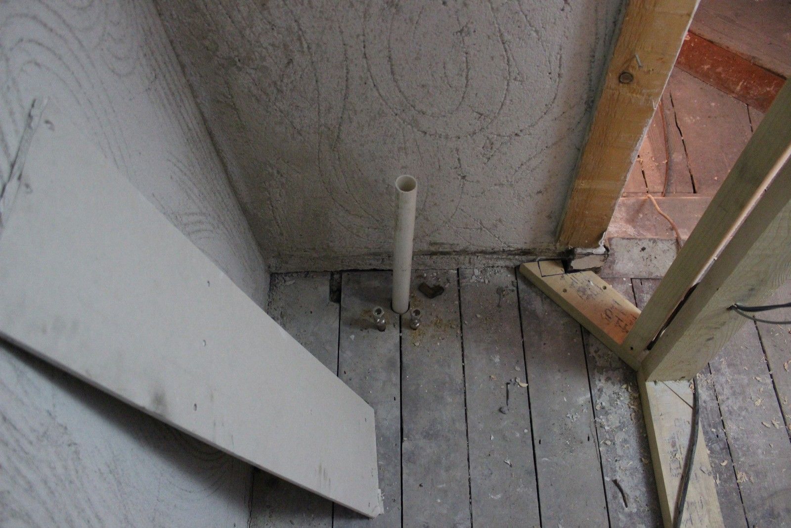 The wall layout upstairs in the return is based pretty much exactly on what was originally there before, with the exception of the extended wall for the small bathroom to be located on the right side. In the picture below, the studs on the right side make up the new bathroom wall, where the hot press was originally located: