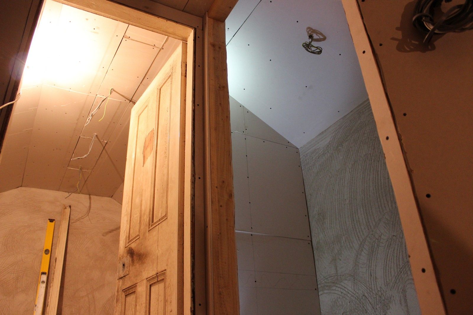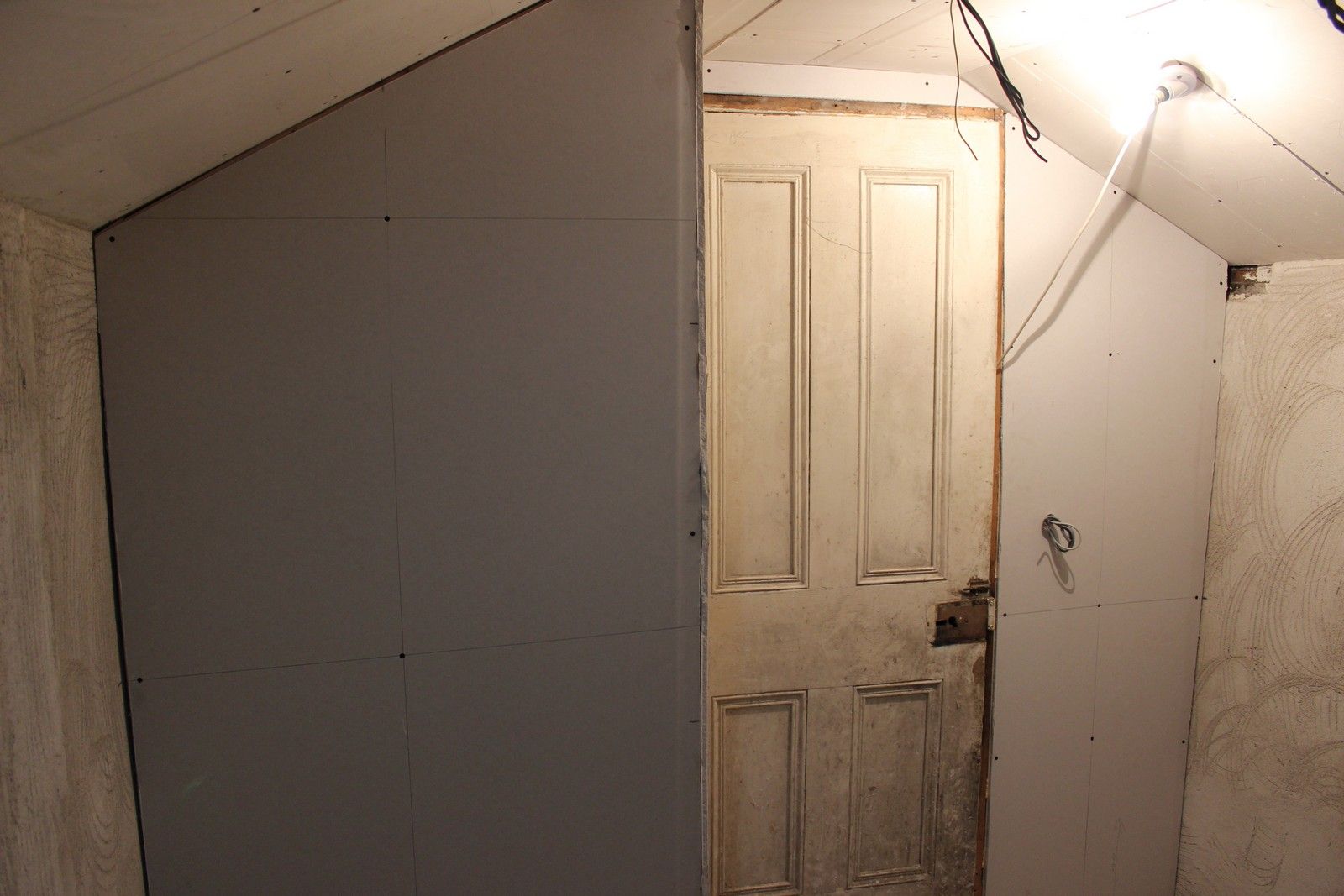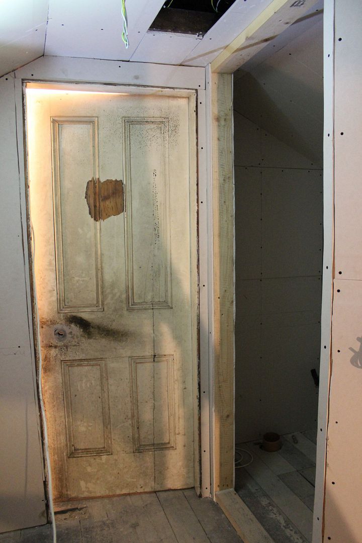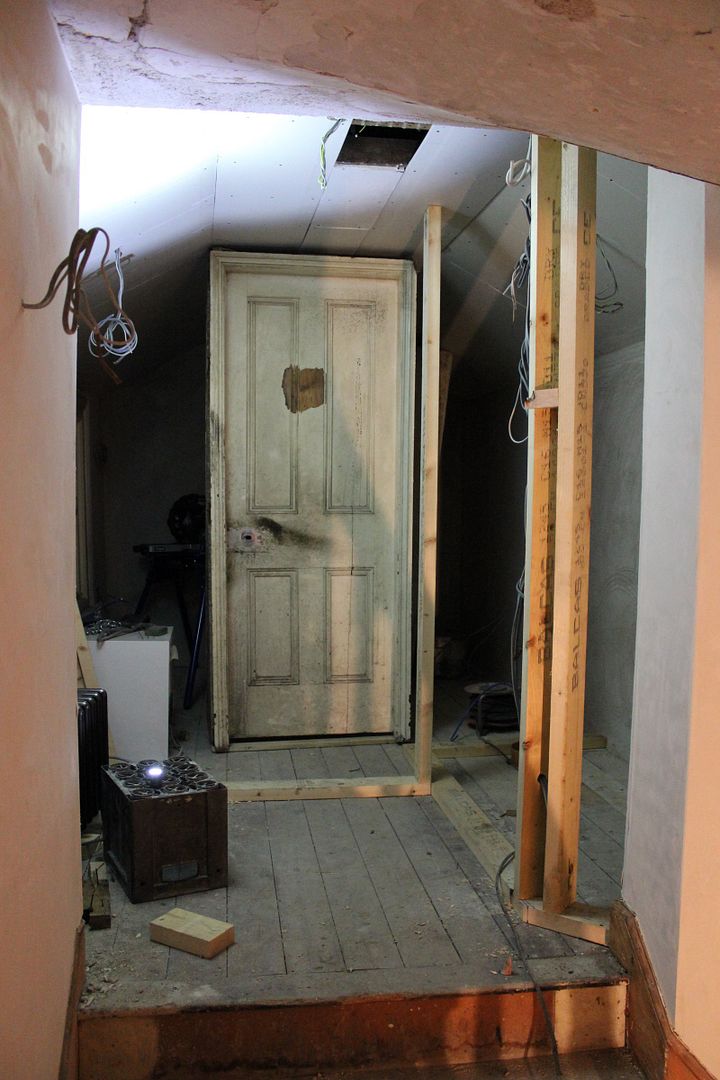 The original door below has been brought out of storage and positioned back where it once stood, albeit a few inches to the left. The small room behind the door was originally a bathroom and will now become a forth bedroom. About 20cm of landing space has been lost to the new small bathroom, however it makes for a decent sized bathroom space: