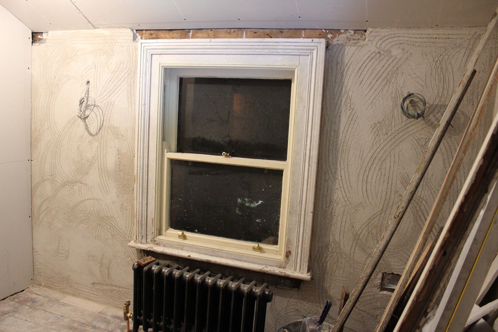 The original, restored sash window, surrounded by lime scratch coat, with a reclaimed Edwardian-style cast iron radiator: