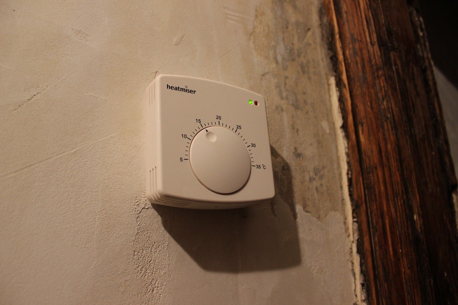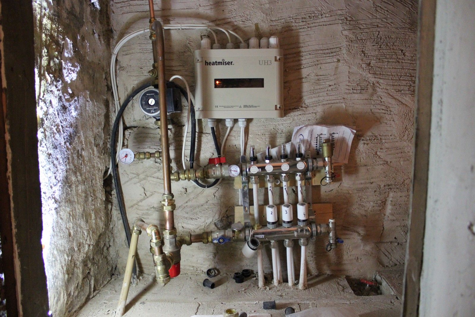 The underfloor heating within the limecrete floor has been a fantastic success so far and has been running continuously for the last four weeks in order to stabalise the heat levels within the fabric of the house, much to the dismay of my wallet. Despite zero insulation and a noticeable breeze from the still-unsealed return, the ground floor rooms are easily maintaining whatever temperature is being set. Currently it is ticking over at approx 16 degrees Celsius to climatise the floorboards before they are laid: